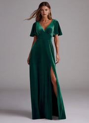 This appealing dress features an A line silhouette, offering a flowy and charming look. The V neckline exudes alluring and gentle vibes, while the flutter sleeves add a touch of delicate and airy style. The tie back detail brings a stylish and customizable element, and the floor length skirt with a high side slit creates a truly appealing and unforgettable style, perfect for bridesmaid duties.