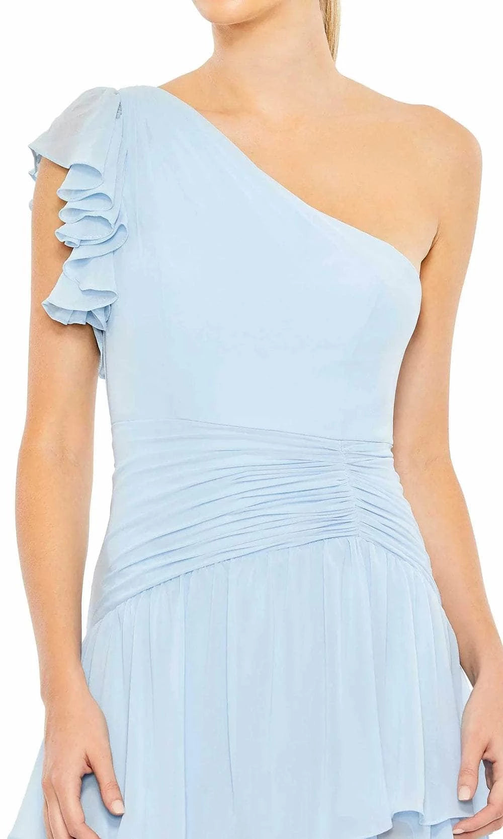 elegant floor-length prom dress features an asymmetric, Ruffled cap sleeve,Thigh-high front slit,one-shoulder design that adds a modern touch to its classic A-line silhouette. The sleeveless cut offers a graceful look while ensuring comfort throughout your event. Perfect for making a sophisticated statement, this dress combines timeless style with contemporary details, ideal for formal occasions where elegance is key.