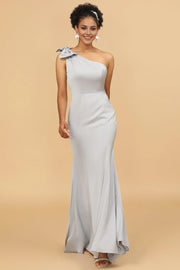 asymmetrical, sleeveless mermaid prom dress features a stunning one-shoulder Grey Satin Bowknot design and a floor-length silhouette that flatters the figure gracefully. Crafted to combine elegance with modern style, it enhances your presence at any formal event. The tailored fit accentuates curves while offering comfort for extended wear, making it an ideal choice for memorable occasions.