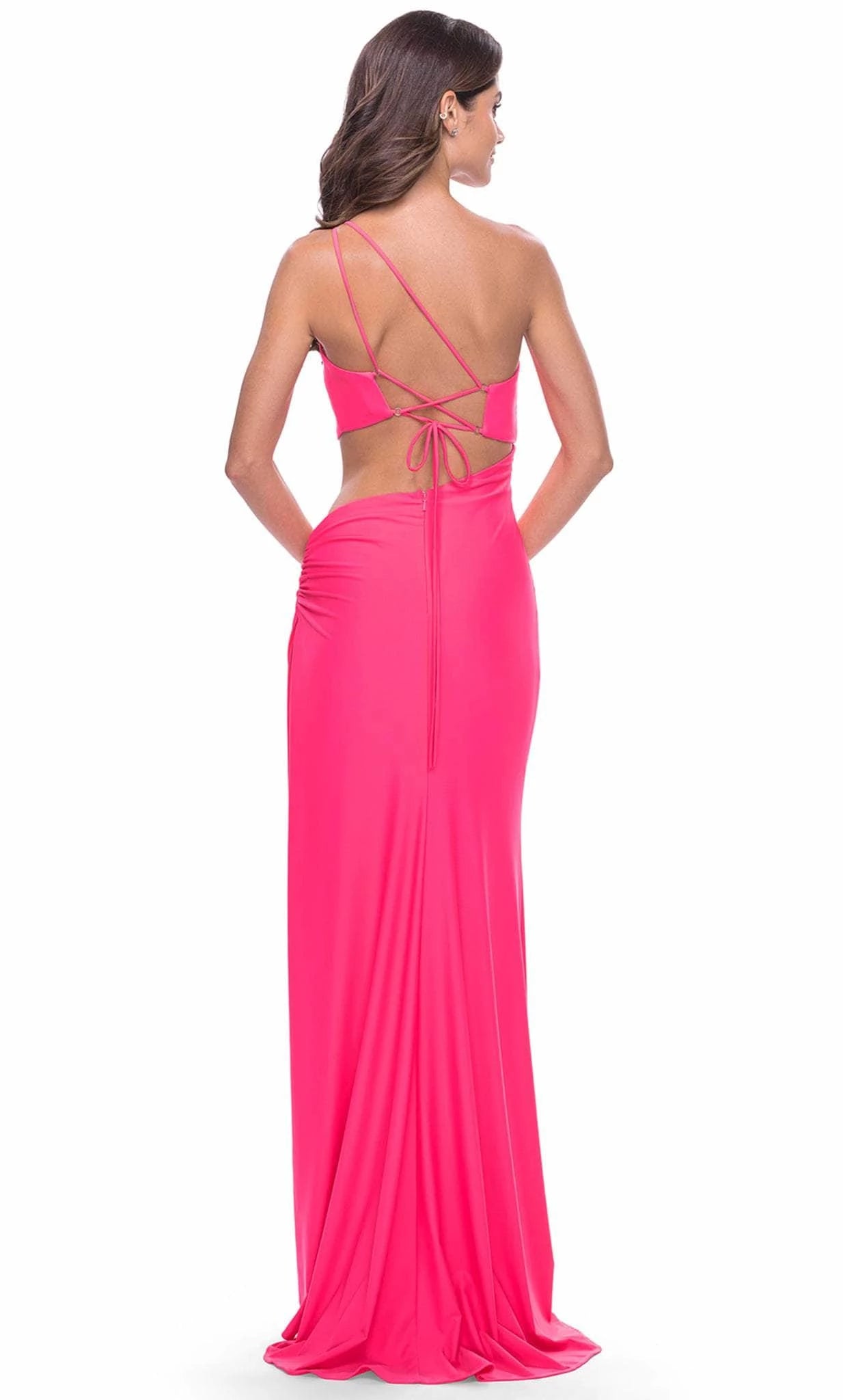 floor-length mermaid prom dress features a striking asymmetrical sleeveless design in vibrant neon pink. Cutout Waist Sweep Train Its sleek, simple silhouette flatters the figure, making it an ideal choice for a standout evening look. Perfect for formal events, this dress combines bold color with elegant lines, ensuring both comfort and style throughout the night.