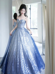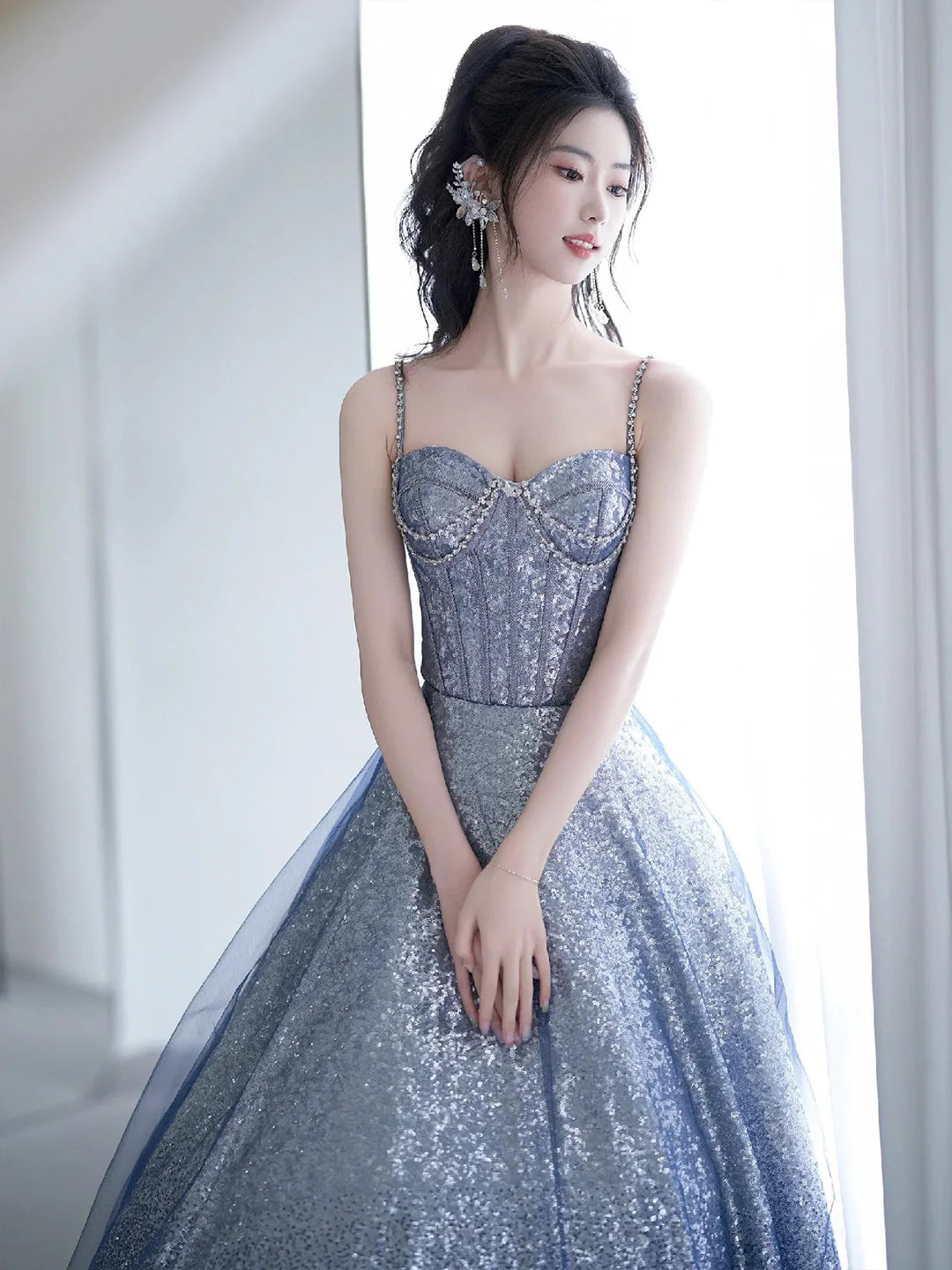 This elegant long prom dress features a flattering sweetheart neckline and delicate blue spaghetti straps. Its gradient sequin design adds a sophisticated shimmer, perfect for evening parties or formal events. The dress combines classic silhouette with modern sparkle, ensuring you stand out with grace and style.