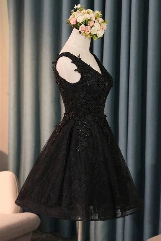 This elegant black party dress features a flattering V-neckline and delicate appliques that add a touch of sophistication. The sleeveless design and intricate beading enhance its charm, making it perfect for homecoming or any special occasion. Its short length offers a youthful, stylish look while ensuring comfort and ease of movement throughout your event.