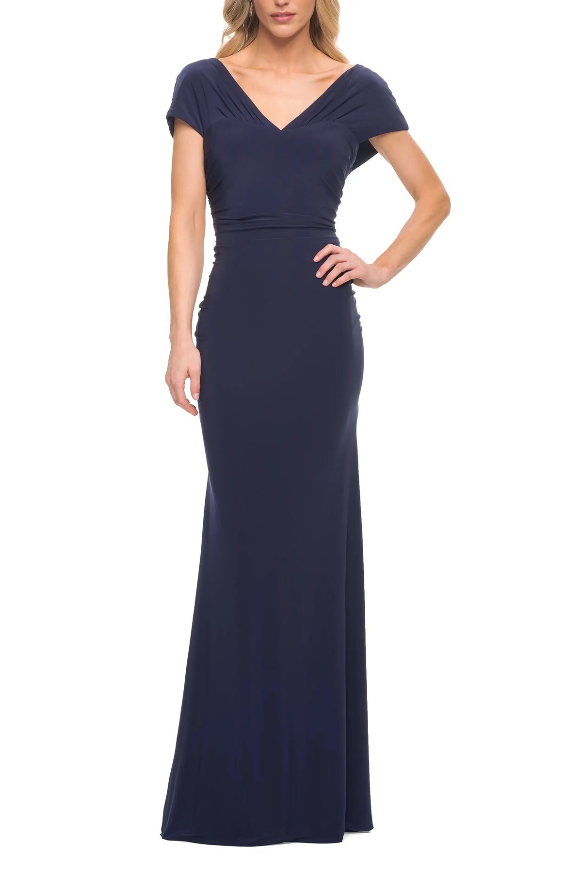 Graceful Sheath V Neck Cap Sleeve Ruched Back Floor Length Evening Dress
