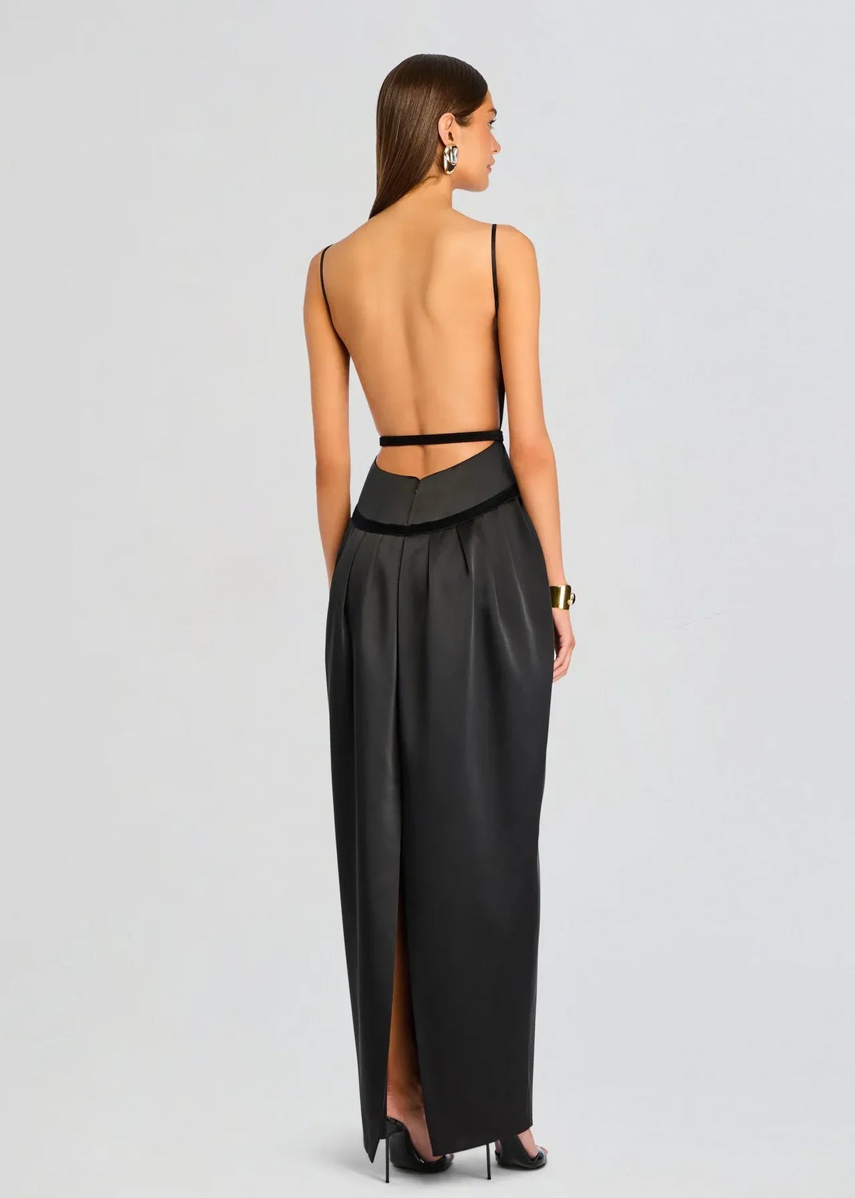 This evening dress features a sheath silhouette that offers a sleek and figure-hugging fit. The boat neck design brings a sophisticated and refined touch, while the sleeveless style provides a chic and effortless look. The open-back accents add elements of alluring charm, enhancing the dress’s overall appeal. With a floor-length design, it’s ideal for evening events, ensuring the wearer looks sophisticated and confident.