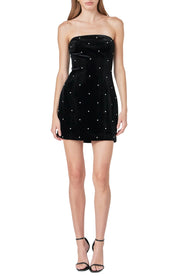 This homecoming dress features a sparkling strapless silhouette with studded details that offer a stylish and eye - catching look. The sleeveless design keeps it sleek, while the zip - back detail ensures a secure fit. With a short - length cut, it’s perfect for homecoming events, ensuring you look stylish and confident.