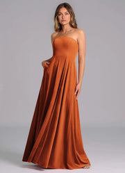 This stunning dress features an A line silhouette, offering a flowy and graceful look. The strapless neckline exudes bold charm, while the sleeveless design adds a touch of modern elegance. The open back detail brings a stylish and alluring element, and the floor length skirt creates a truly stunning and unforgettable style, perfect for bridesmaid duties.
