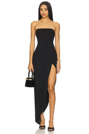 This dress features a stylish sheath silhouette with a strapless design, sleeveless style, a high-slit, and an asymmetric length that offer a sophisticated and fashionable look. It’s perfect for evening events, ensuring you look stylish and confident.