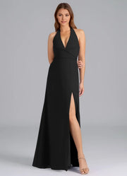 This sultry dress features an A line silhouette, offering a flowy and flattering look. The halter neckline exudes alluring charm, while the sleeveless design adds a touch of minimalist elegance. The open back detail brings a stylish and alluring element, and the floor length skirt with a side slit creates a truly sultry and unforgettable style, perfect for bridesmaid duties.