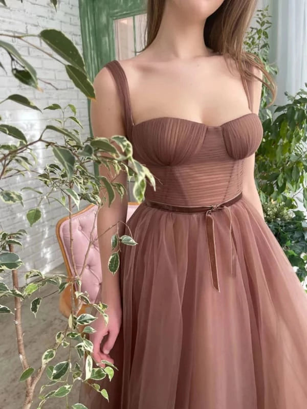 This tea-length brown tulle dress combines elegance with versatility, perfect for prom, formal graduations, evening events, parties, and homecomings. Its delicate fabric and refined design offer a graceful silhouette, ensuring you stand out with timeless sophistication at any special occasion.