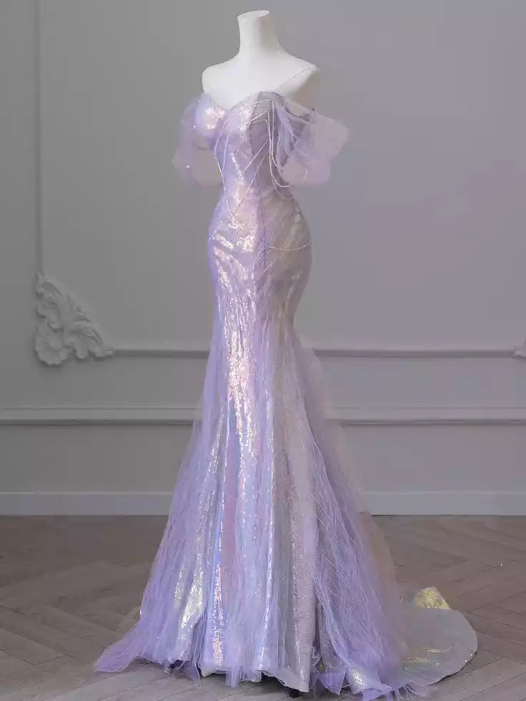 This elegant evening gown features delicate puff sleeves and a floor-length silhouette that exudes sophistication. Crafted with a tulle train adorned with subtle tassels and pearls, it offers a graceful movement perfect for formal occasions. Designed to combine classic charm with modern details, this prom dress ensures a refined and memorable presence.